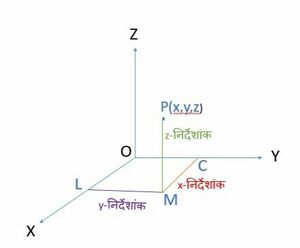 मान लीजिए कि अंतरिक्ष में एक बिंदु है जैसा कि नीचे दिए गए चित्र में दिखाया गया है। यदि हम तल पर एक लंबवत छोड़ते हैं और फिर बिंदु से, हम क्रमशः -अक्ष और -अक्ष पर लंबवत और छोड़ते हैं। लंबवत , और की लंबाई क्रमशः , और मानते हुए। इन लंबाइयों , और को त्रि-आयामी अंतरिक्ष में बिंदु के निर्देशांक के रूप में जाना जाता है। यह ध्यान रखना चाहिए कि किसी बिंदु के निर्देशांक देते समय, हम उन्हें प्रायः क्रम में लिखते हैं ताकि -अक्ष का निर्देशांक पहले आए, उसके बाद -अक्ष और -अक्ष का निर्देशांक आए। इस प्रकार अंतरिक्ष में प्रत्येक बिंदु के लिए, इसके प्रतिनिधित्व के लिए वास्तविक संख्याओं का एक क्रमबद्ध -टपल उपस्थित होता है।