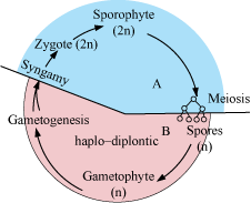 • हैप्लो-डिप्लॉन्टिक जीवन चक्र में अगुणित युग्मकोद्भिद और द्विगुणित बीजाणुद्भिद् के बीच पीढ़ियों का प्रत्यावर्तन होता है।