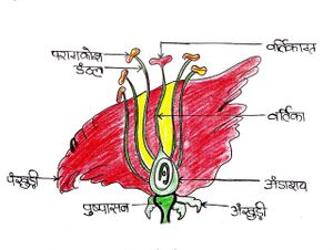 - जायांग- पुष्प का मादा अंग है जो बीजाणु का निर्माण करता है I ये फूल का सबसे भीतरी घेरा है जिसमें एक या एक से अधिक स्त्रीकेसर होते हैं। प्रत्येक स्त्रीकेसर के तीन भाग होते हैं- कलंक, शैली और अंडाशयI