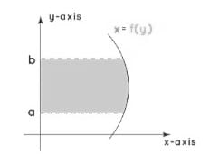 -अक्ष के सापेक्ष क्षेत्रफल: वक्र x = f(y), -अक्ष द्वारा परिबद्ध वक्र का क्षेत्रफल, रेखाओं y = a और y = b के पार, नीचे दिए गए व्यंजक द्वारा दिया गया है। इसके अलावा, वक्र और -अक्ष के बीच के क्षेत्र को नीचे दिए गए ग्राफ से समझा जा सकता है।
